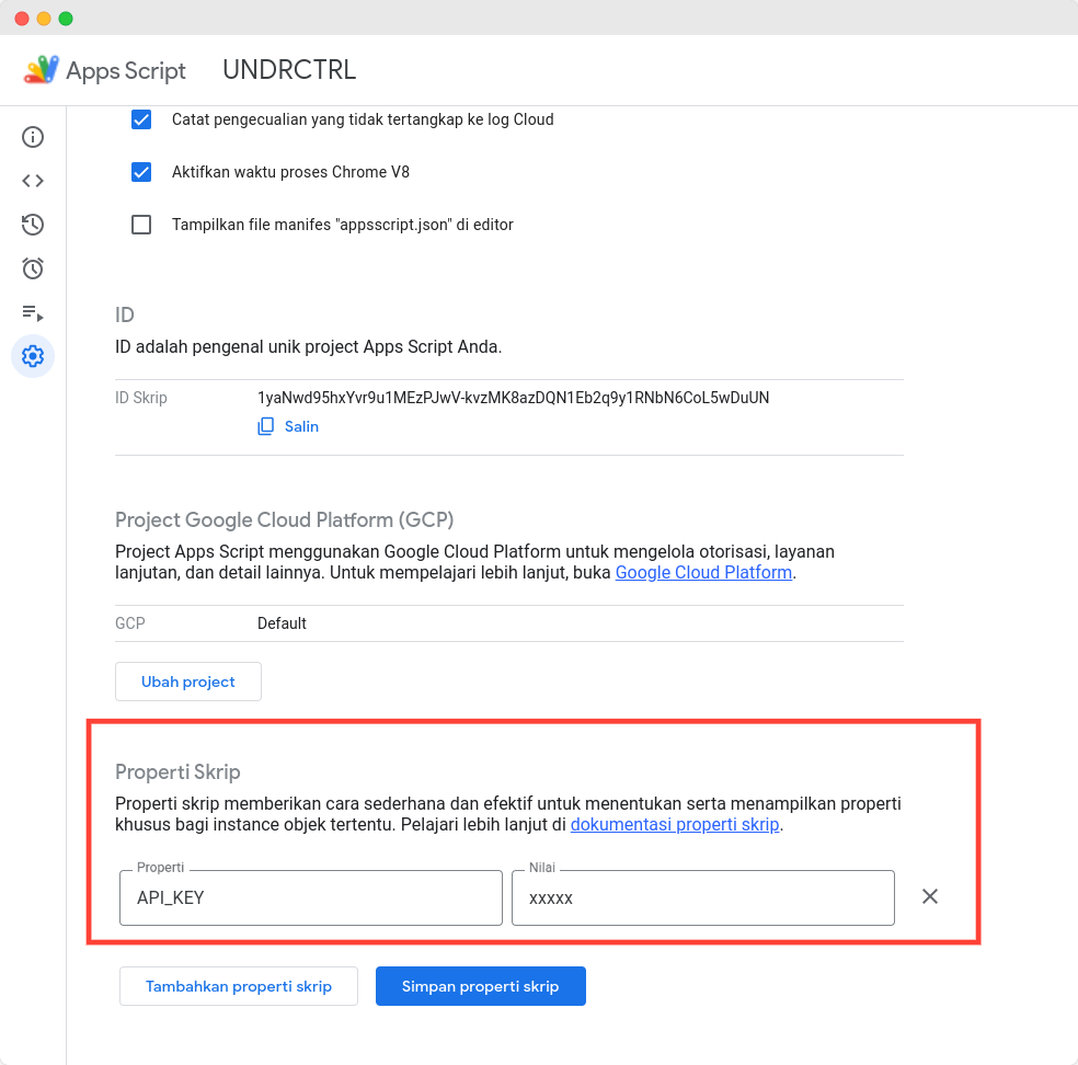 PilihEktensi > Apps Script > Setelan Project > Properti Script. Buat properti API_KEY dan isikan dengan API key UNDRCTRL Anda.