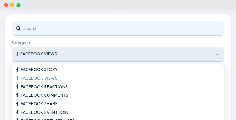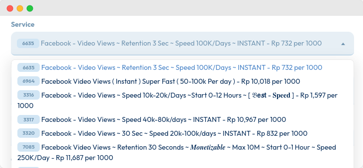 Pada form order, cari kategori “Facebook” dan pilihFacebook Video Views.
