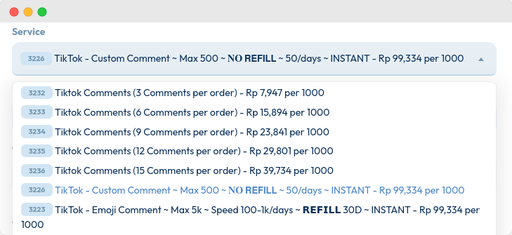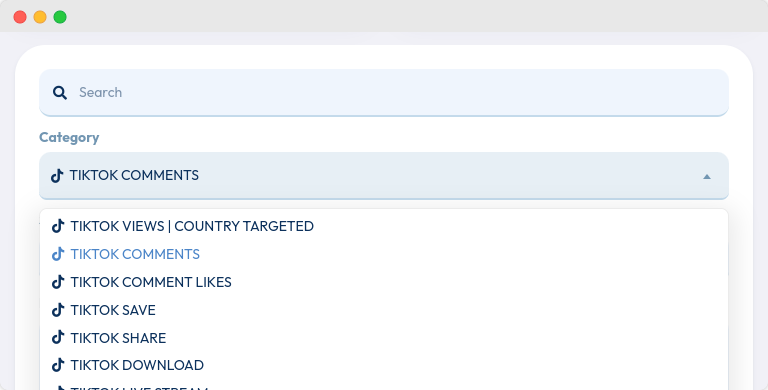 Pada form order, cari kategori “TikTok” dan pilihTikTok Comments.